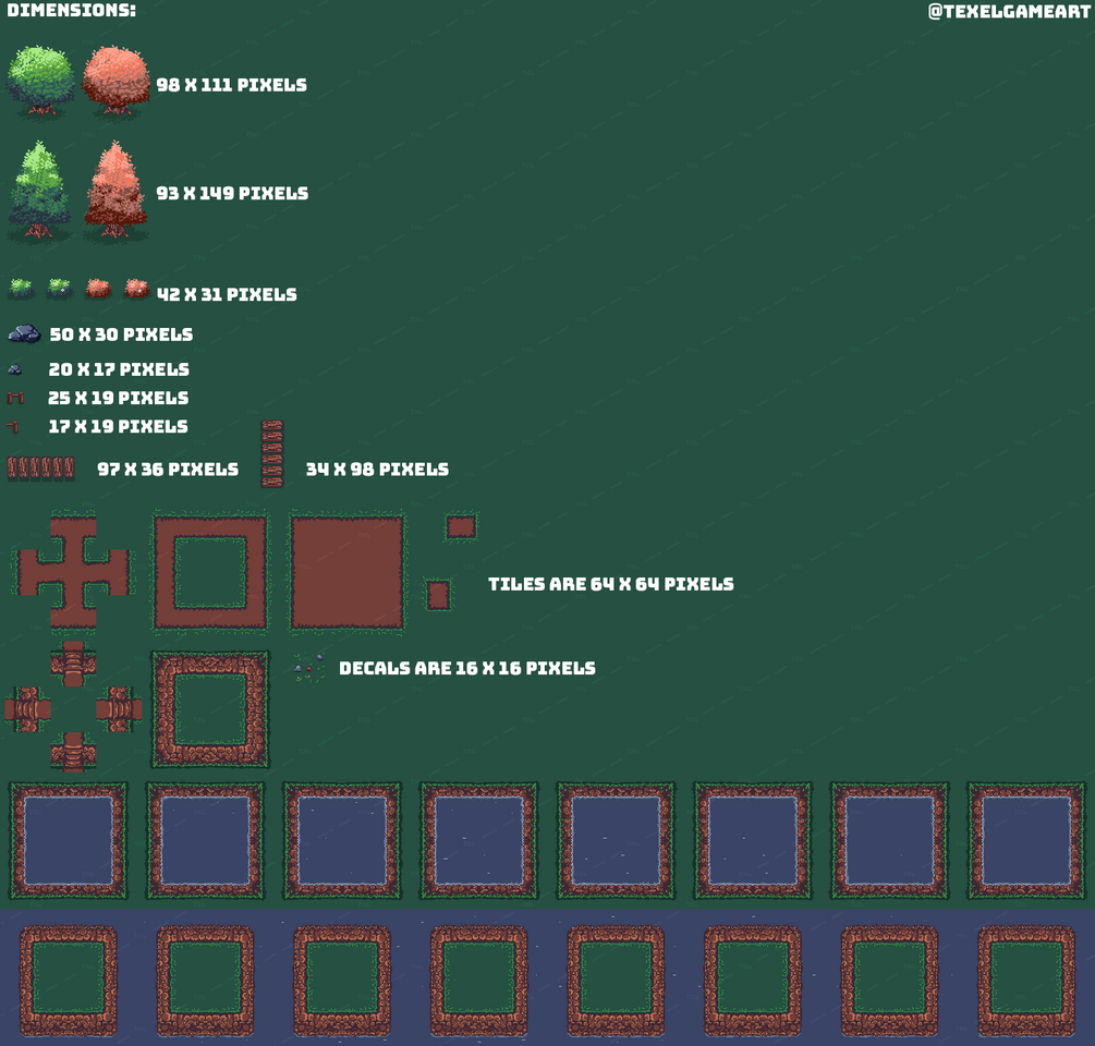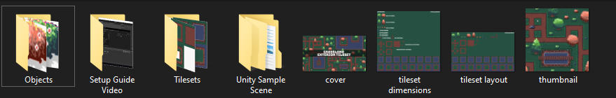 In this product, you'll get a 64 x 64 grassland tileset, 16 x 16 decal tileset, 64 x 64 animated water tileset, and additional objects like trees and bushes. You'll also get the Unity Sample Scene file.